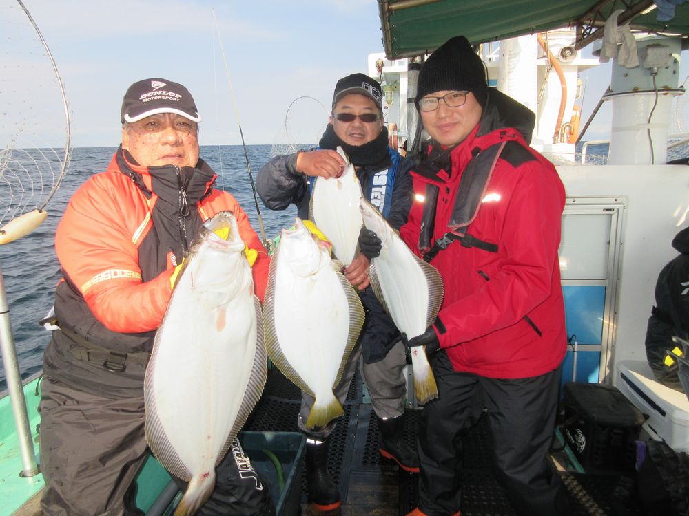 本日午前便5名様での釣果・・・60cm頭に船中34枚、竿頭9枚、その他リリースに数枚でした。